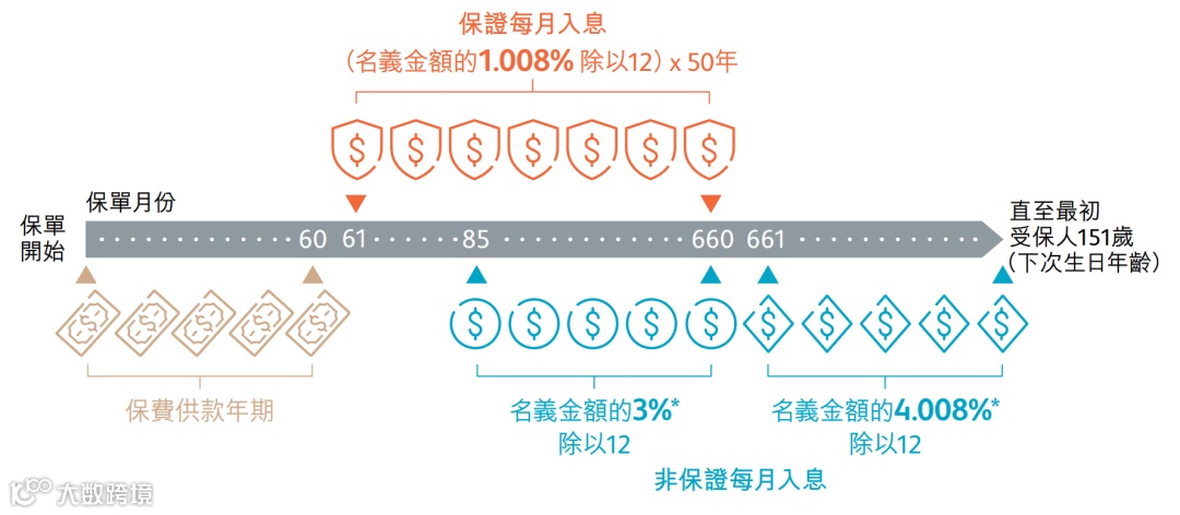 从第85个保单月份开始,客户每个月可获得1230美元非保证每月入息,直到第660个保单月份结束。
