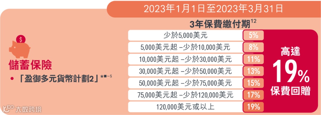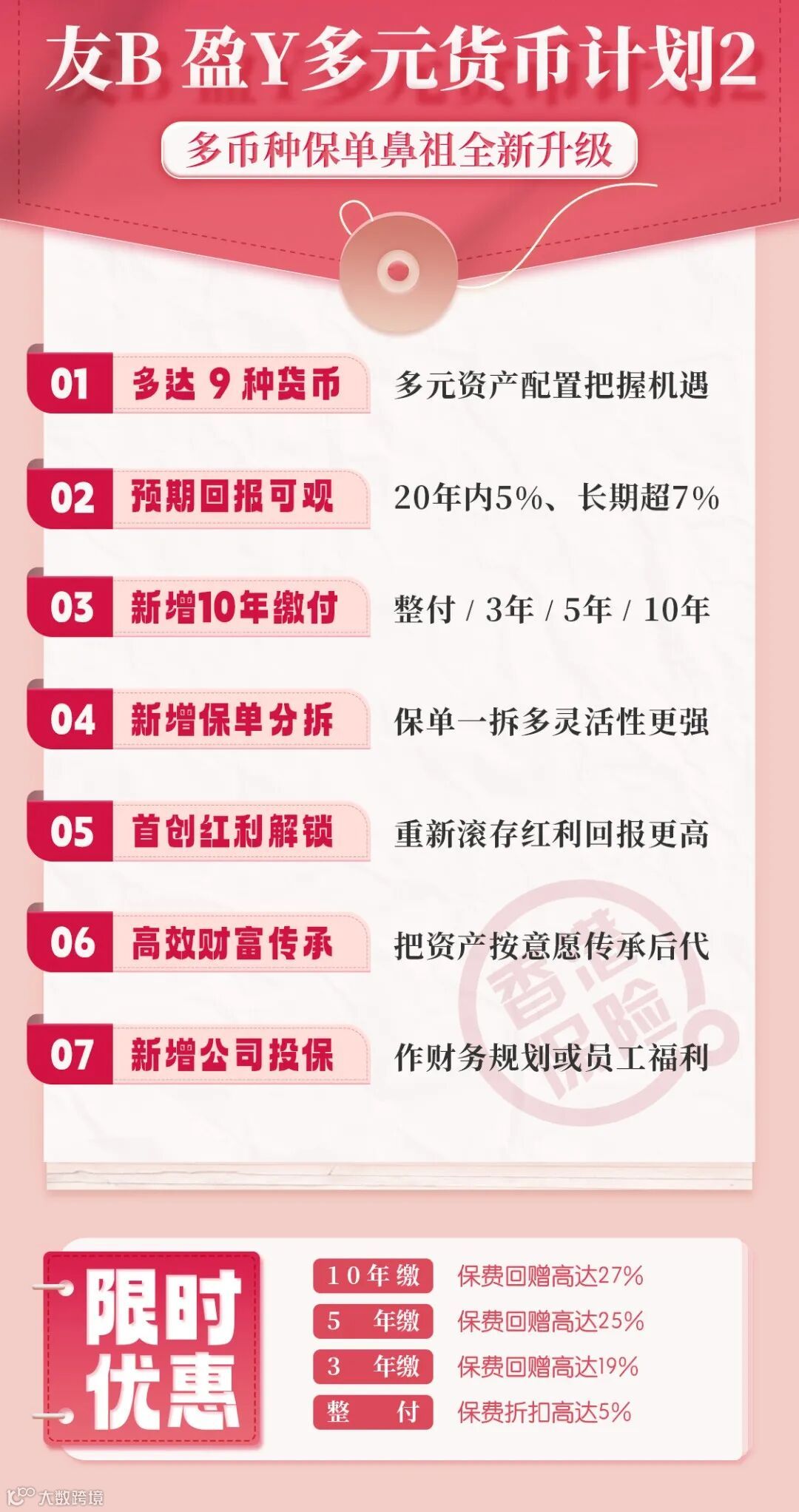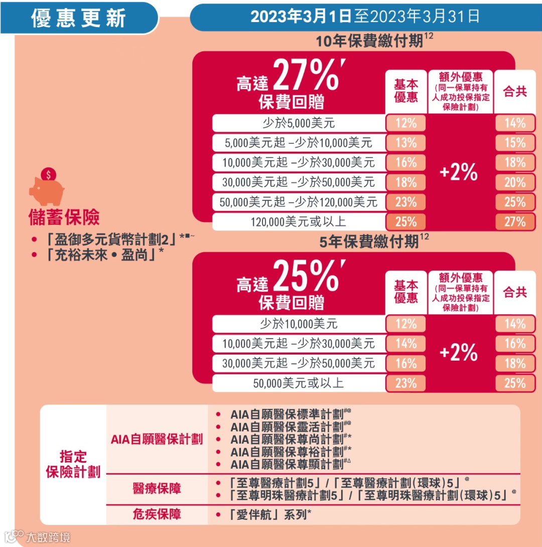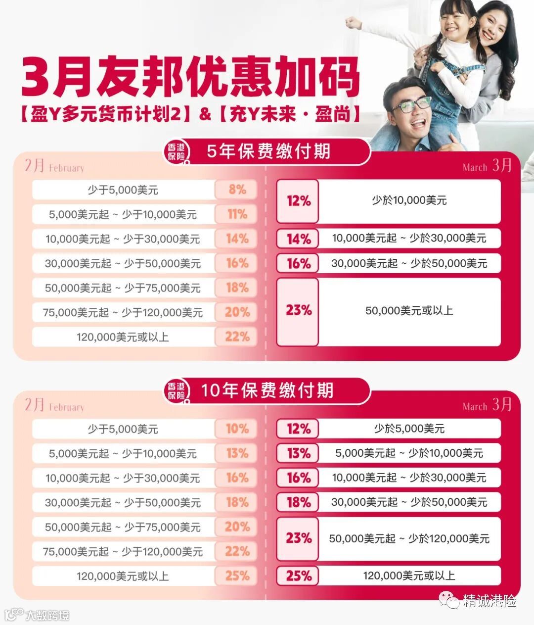 3月分来临,香港友邦优惠力度再加码!「盈御多元货币计划2」作为香港多币种标杆产品,5年、10年缴费期优惠加码,5年缴费期起步优惠8%→12%,最高档22%→23%;10年缴费期起步优惠10%→12%,最高档25%!「盈御多元货币计划2+爱伴航」组合优惠+2%!