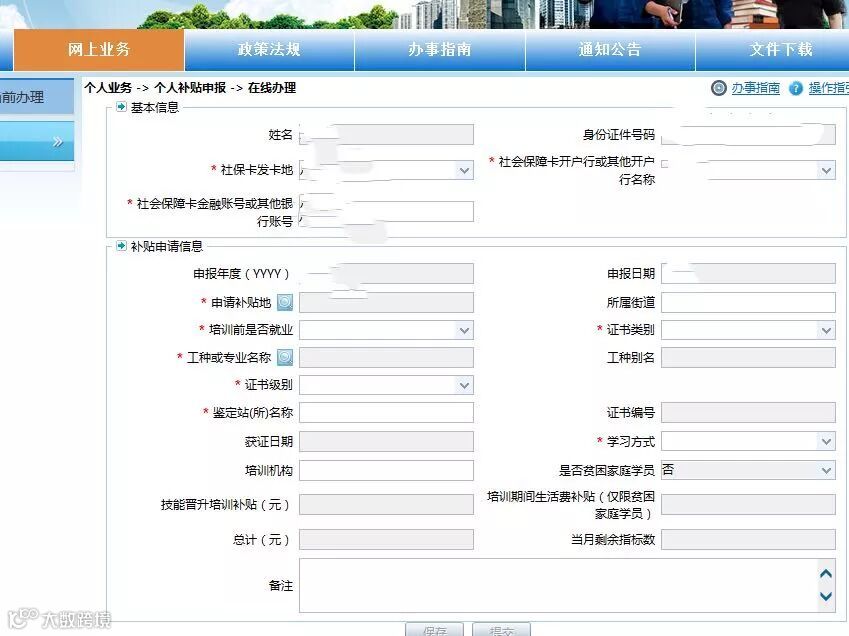 ⑥保存→点击上网业务中业务菜单→个人业务→个人补贴申报→在线办理