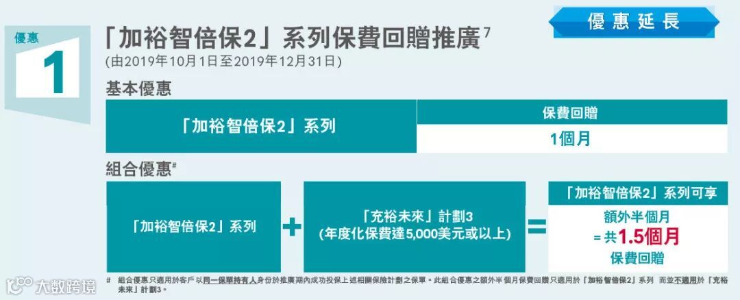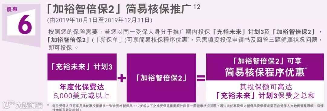 通过此优惠投保重疾险「加裕智倍保2」的总保额,不可多于「充裕未来3」计划的总保费,新保单投保额随着受保人的年龄调整限额。最高投保额以两者较低者为准。