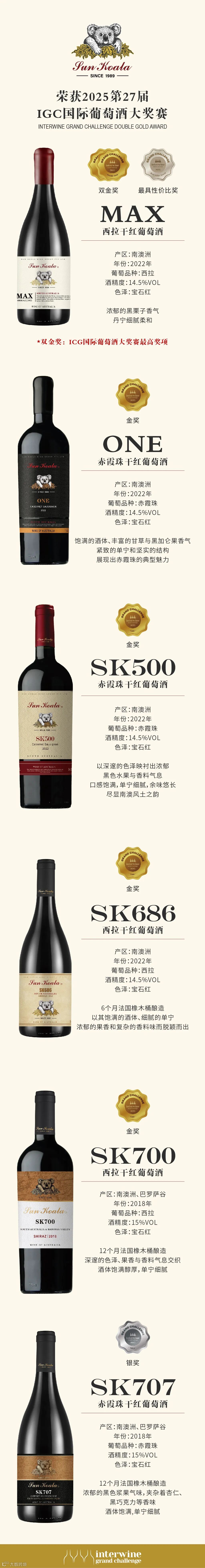 由经过专家评审团的专业评审和复审。在这场世界级味觉竞技中,阳光考拉携旗下MAX、ONE、SK686、SK500、SK700、SK707,六款产品惊艳亮相,参赛酒品摘取桂冠,荣获"双金奖一项+金奖4项+银奖一项+最具性价比一项奖"的全满贯战绩。特别是阳光考拉MAX西拉干红葡萄酒,以卓越品质征服国际舞台!凭借独特的酿造工艺与非凡口感,以优异的成绩在第27届IGC国际葡萄酒大奖赛中荣获“双金奖”和”最具性价比“奖双项奖项。