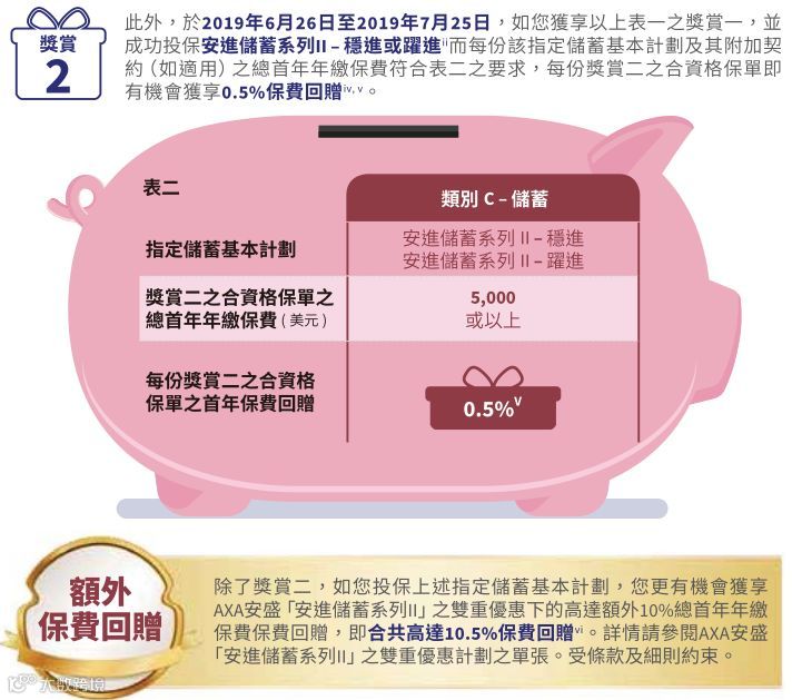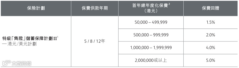 成功投保特级「隽陞」储蓄保障计II ,并达指定首年总年度化保费 ,可享高达5%首年总年度化保费回赠!
