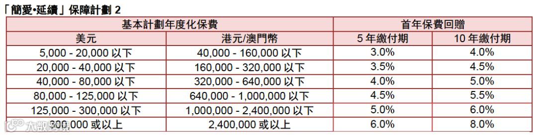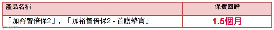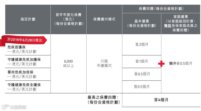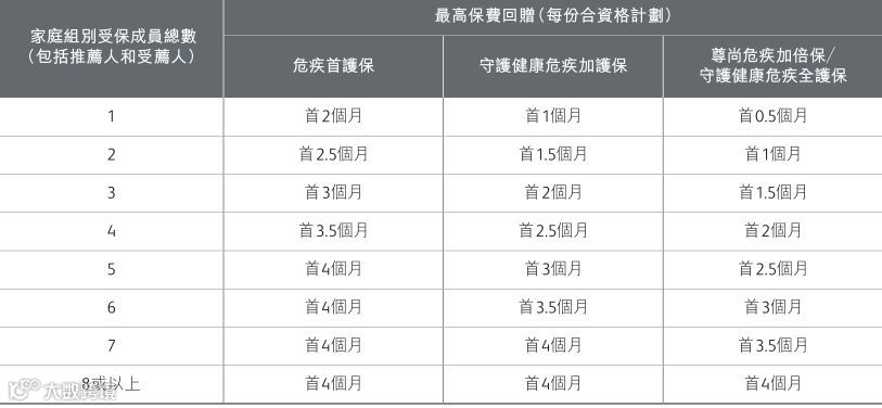 首年年度化保费达6,000港元或以上,可享保费回赠「基本优惠」。若您与家庭成员于推广期内同时投保指定计划,每人更可享额外保费回赠「家庭优惠」,即可享高达共首4个月保费回赠。