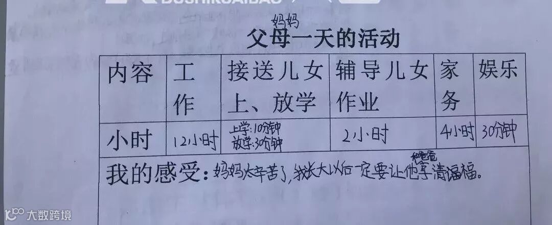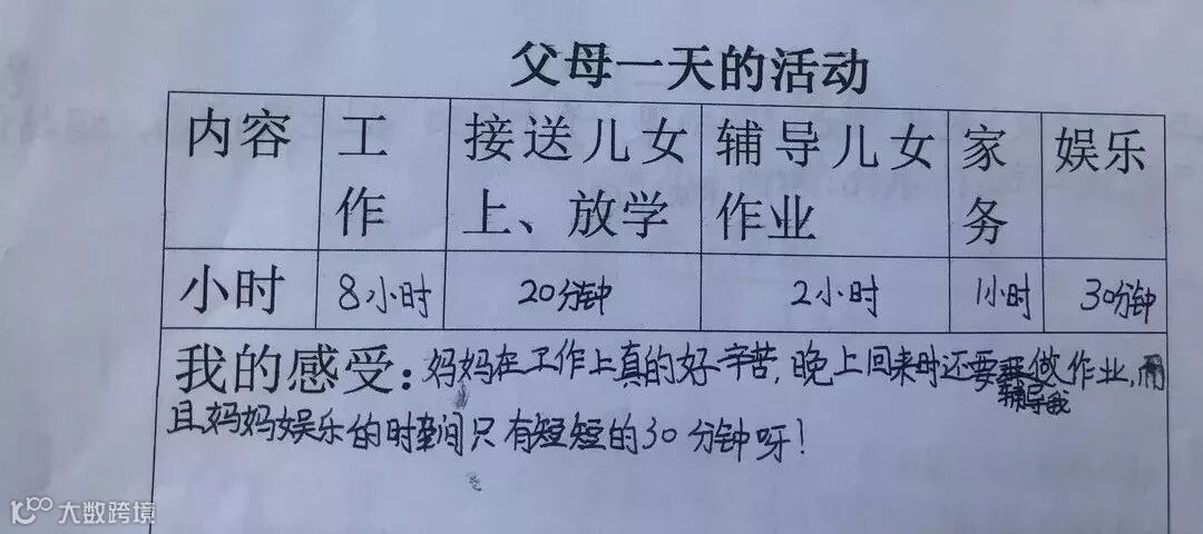 工作时间5小时,送上学15分钟,接放学25分钟,辅导孩子3小时,家务半小时,娱乐仅5分钟。