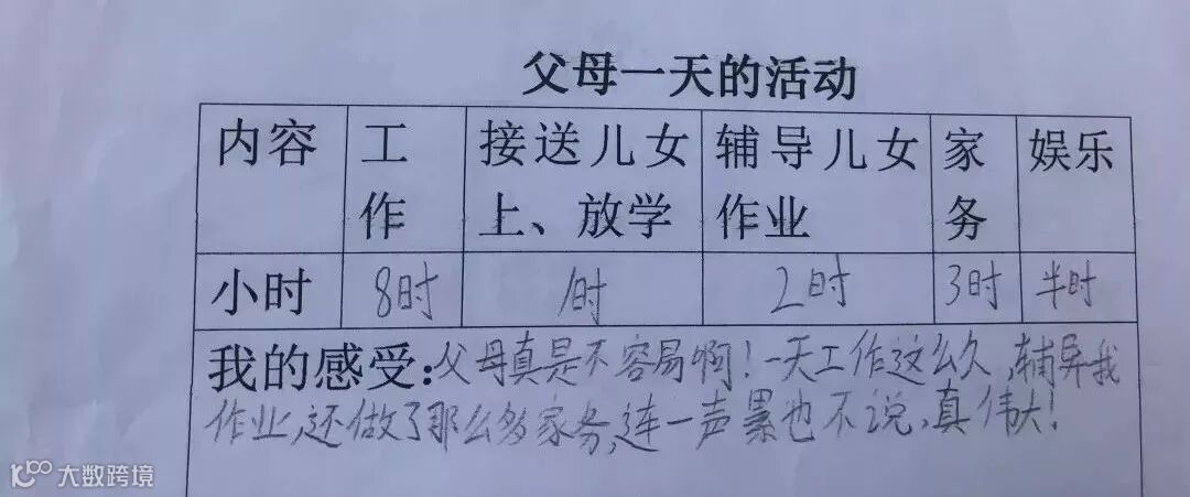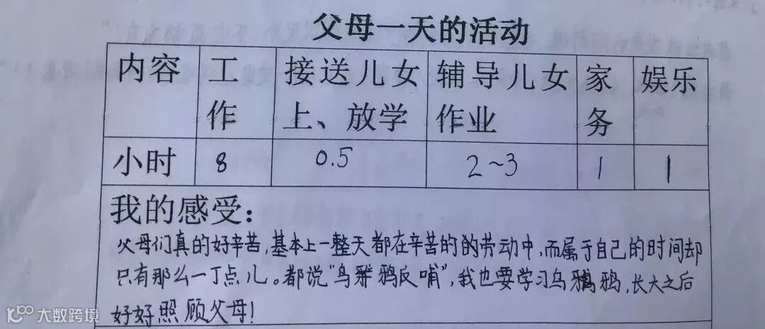 还有个孩子说,父母真的好辛苦,基本上一天都在辛苦的劳动中。而属于自己的时间却只有那么一丁点儿。都说“乌鸦反哺”,我也要学习乌鸦,长大之后好好照顾父母。