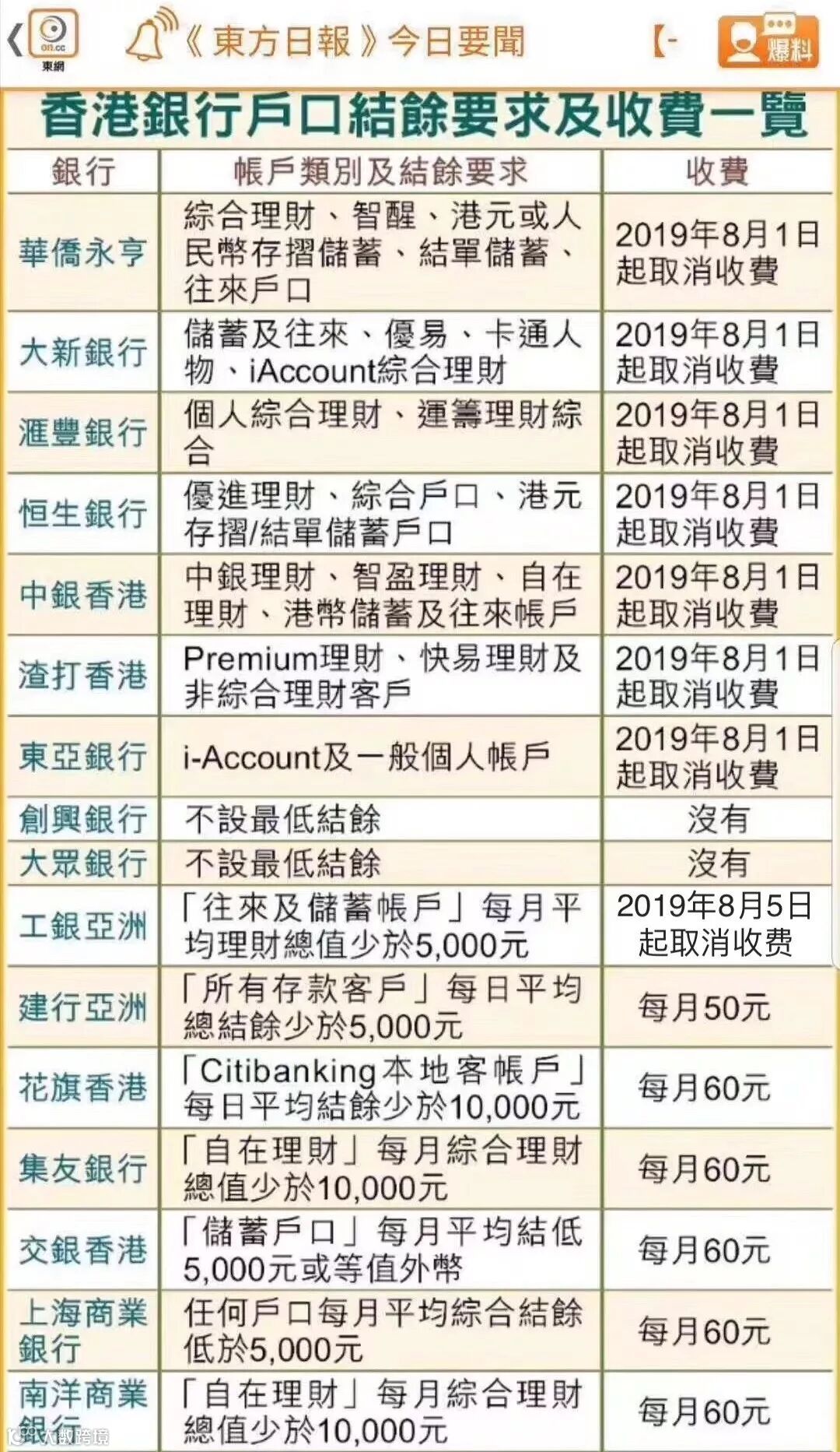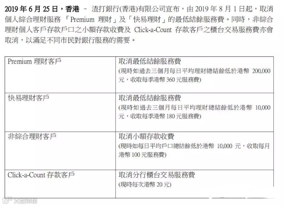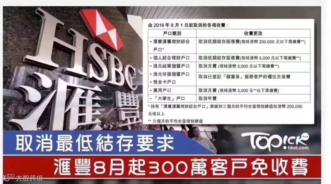 6月19日,汇丰银行率先宣布:从8月1日起,取消个人综合理财账户最低总额要求及服务费用,以及月费年费等交易费用。