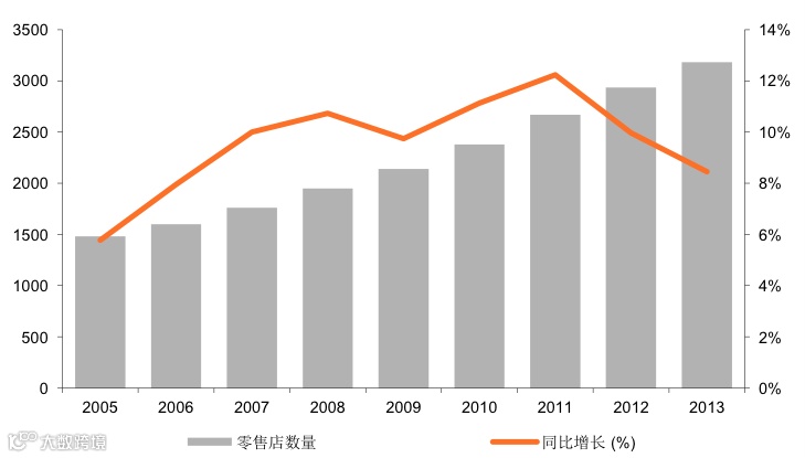 奢侈品零售店数量及同比增长(%)