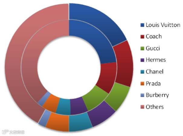 皮具市场份额 – 2004 (里圈)与2013(外圈)对比