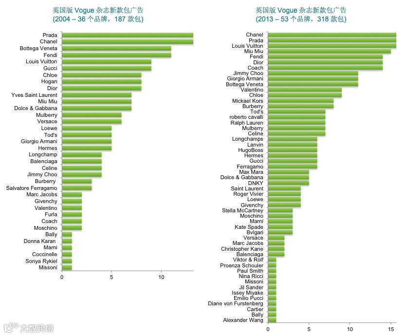 在时尚杂志投放广告的的手袋品牌和款式数量过去十年大幅增长: