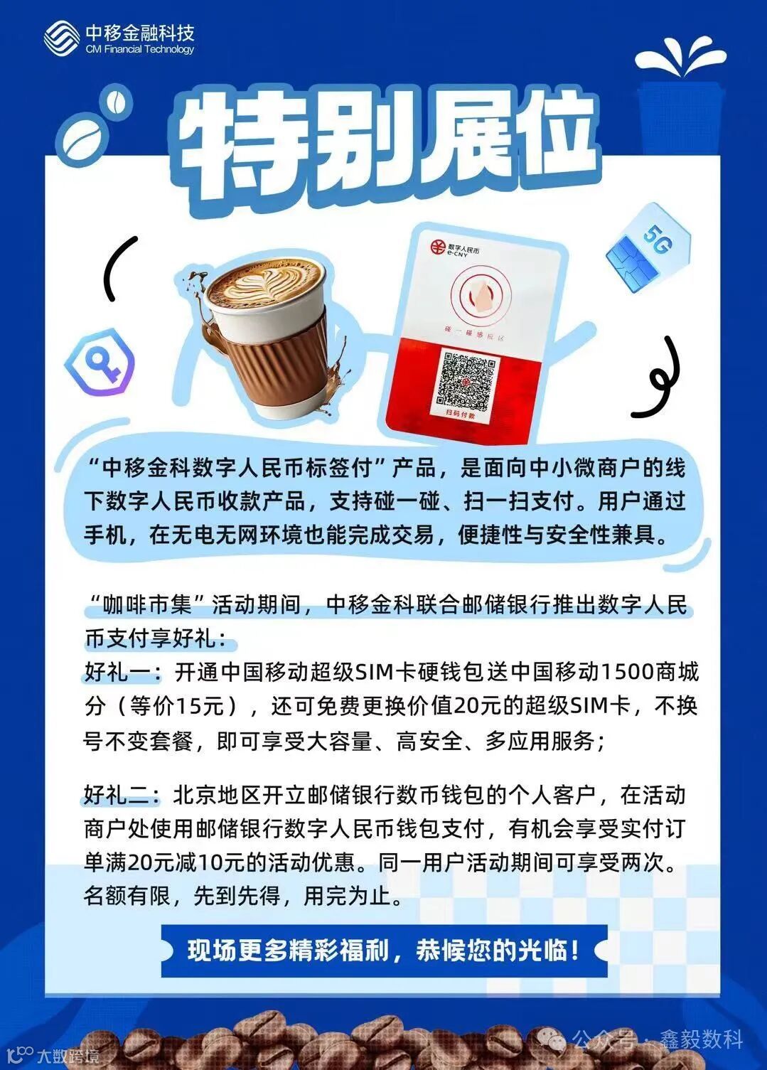该产品是面向中小微商户的线下数字人民币收款产品,支持碰一碰、扫一扫支付。用户通过手机,在无电无网环境也能完成交易,便捷性与安全性兼具。本次国际咖啡嘉年华,中移金科联合邮储银行推出数字人民币支付享好礼(详见下图)。现场开通中国移动超级SIM卡硬钱包、办理邮储银行信用卡赠送精美礼品,还额外加赠本次活动免费咖啡/礼品兑换券!数量有限,先到先得哦!