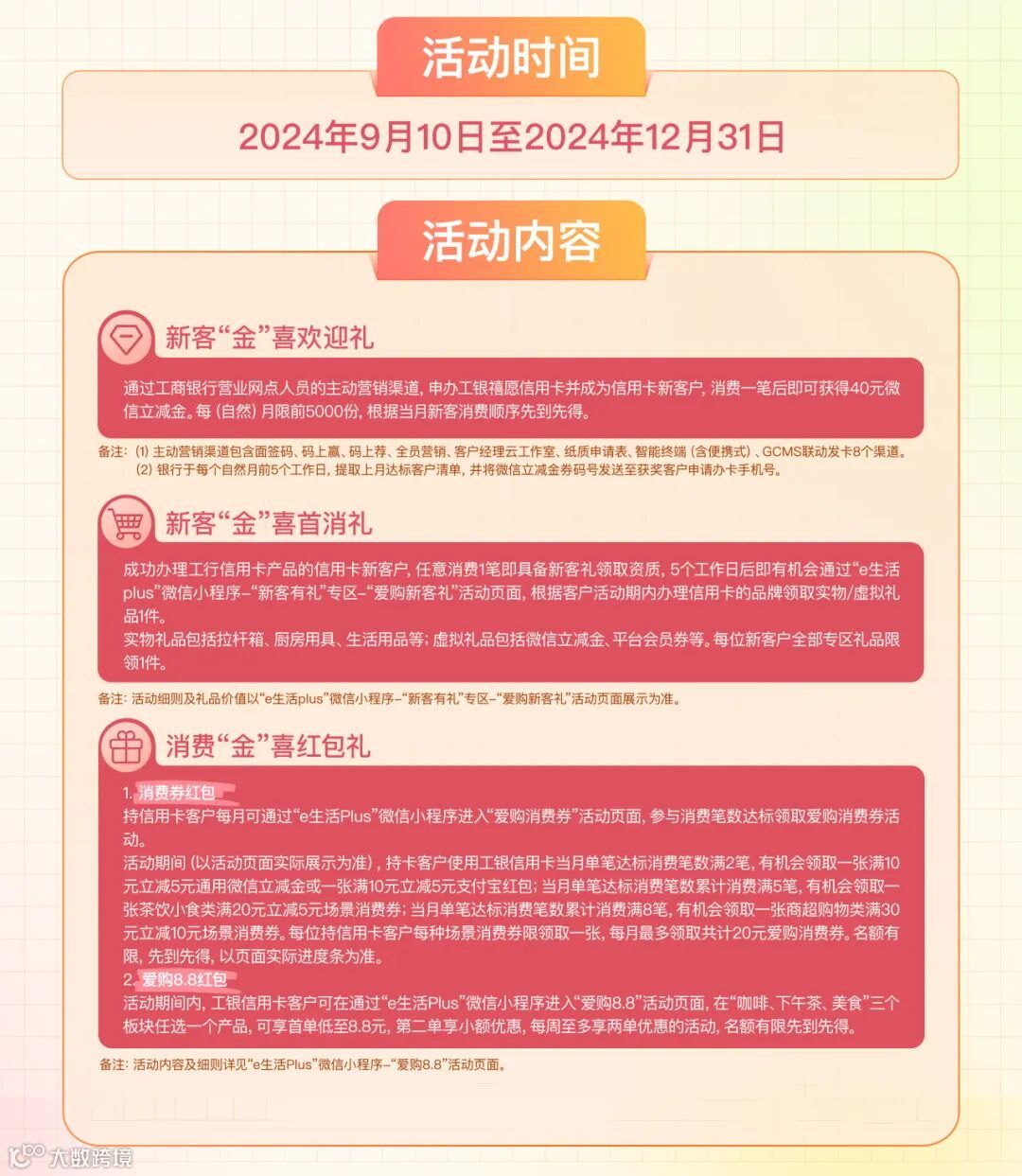 工商银行推出到店客户营销活动 “‘金’喜享好礼”。即日起至2024年12月31日,新客申办工银禧愿信用卡有欢迎礼和首消礼,持信用卡客户还有消费券红包礼和爱购 8.8 红包礼,活动详情可滑动下图了解。咖啡嘉年华期间,到工行展台处扫码体验,可获得精美小礼品及免费咖啡/礼品兑换券!
