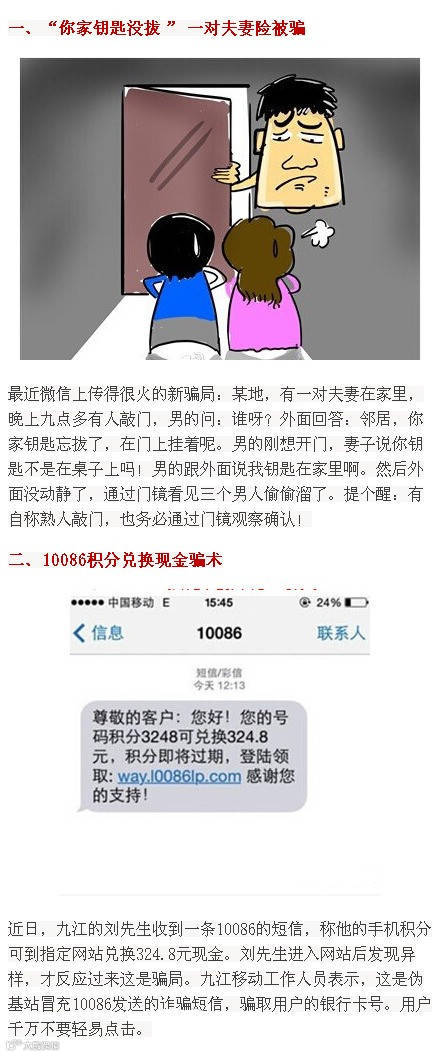 年底了,骗子和小偷开始蠢蠢欲动,各种骗术花样百出,令人防不胜防,什么“你家钥匙没拔”、“到我办公室来一下”、“积分兑换现金”等等。最近流行的十大骗术,赶紧了解一下,谨防上当受骗。