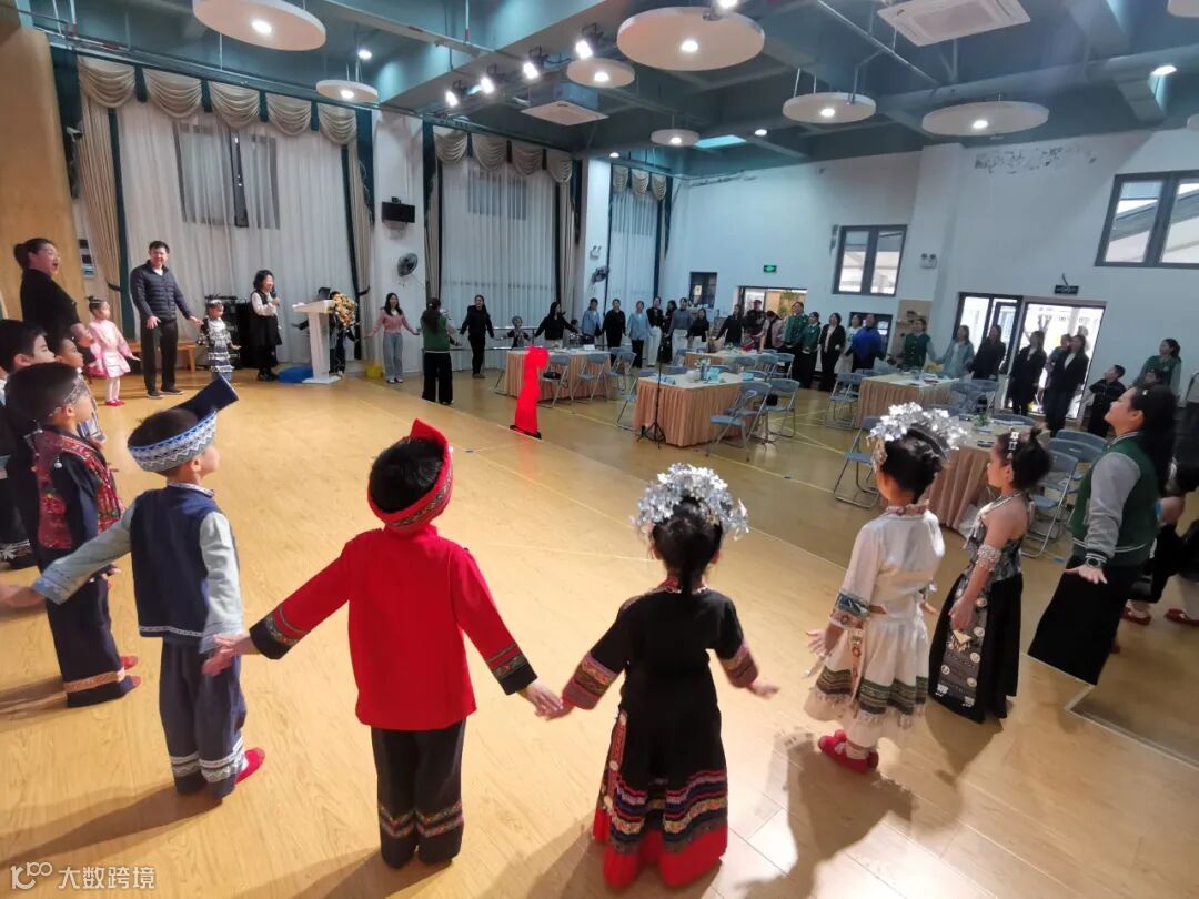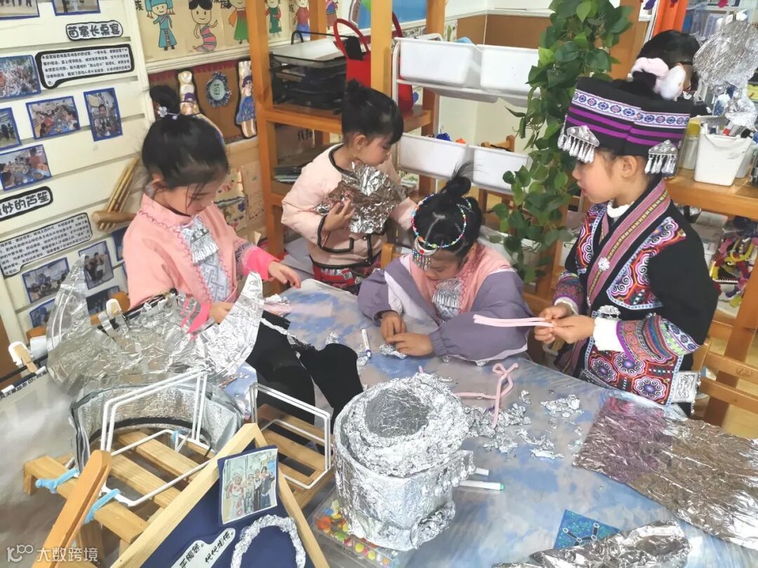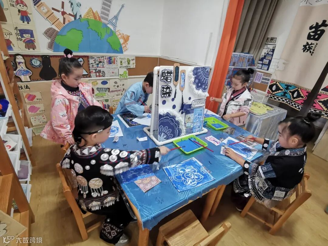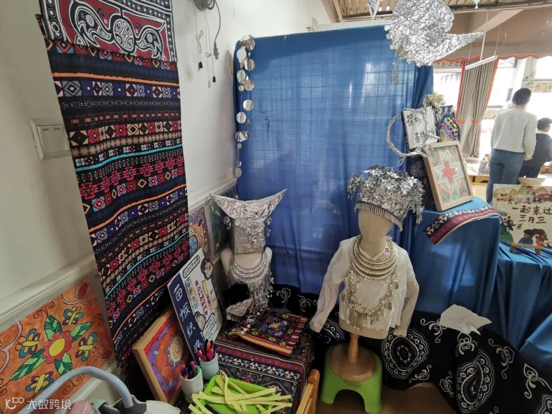 参观班级和园所环境,在观摩班级环境的过程中,大家都能找到主题剧中所呈现的内容的影子。特别是大班的主题剧《一起来过三月三》,生动立体地呈现了孩子们探索苗族的过程。大家在主题剧中看到的苗族美食、苗歌苗舞、苗族银饰、苗族服装和苗族蜡染等等,都能在班上找到孩子们探索学习的痕迹。