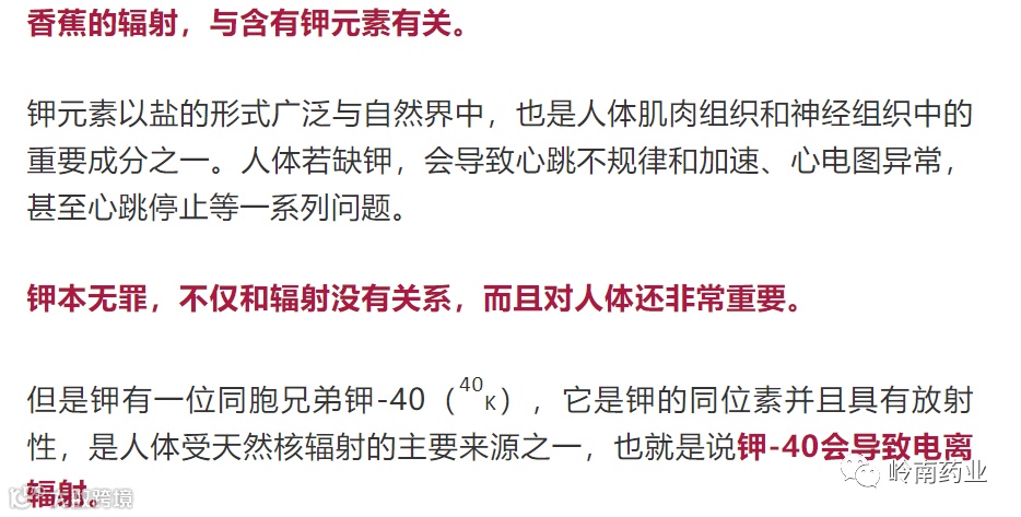 而香蕉的辐射就是源于这种放射性元素钾-40。因为香蕉中的钾含量在水果中是相对丰富的,因此钾-40的含量也就相对更高。