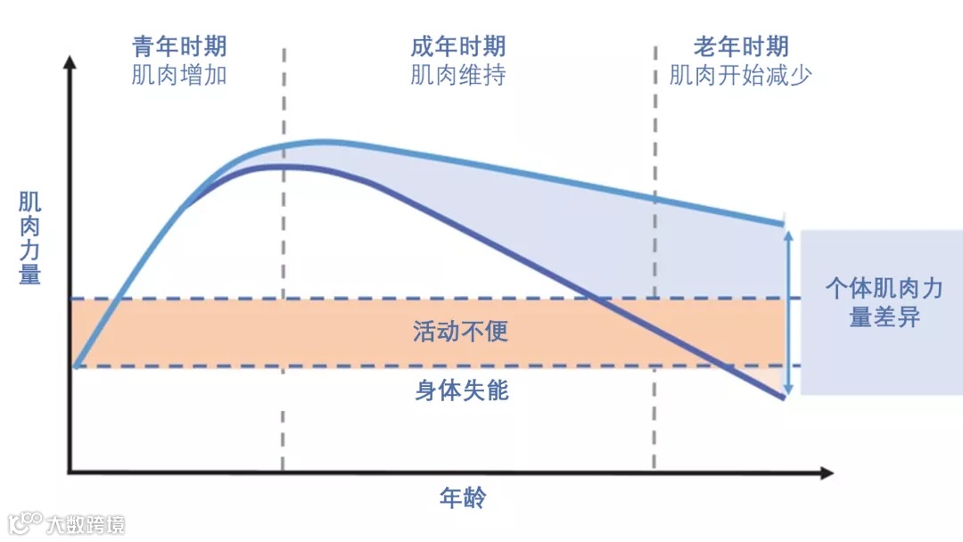 一般来说,35 岁左右我们的肌肉开始流失,并且以每年 1%~2% 的速度下降,50 岁以后进入加速阶段,75 岁后,下降速度会达到顶峰。