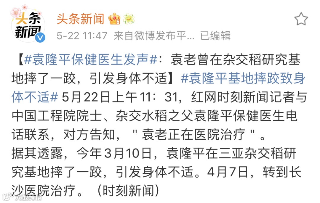 袁老在三亚杂交稻研究基地摔了一跤,引发身体不适。4 月 7 日,转到长沙医院治疗。