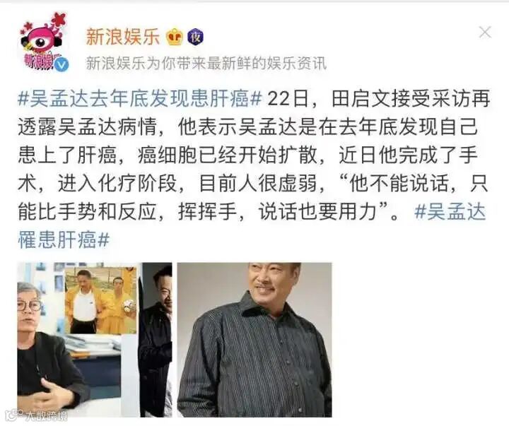 据新浪娱乐消息:2月22日,田启文接受采访时透露吴孟达病情,表示他是在去年底发现自己患上了