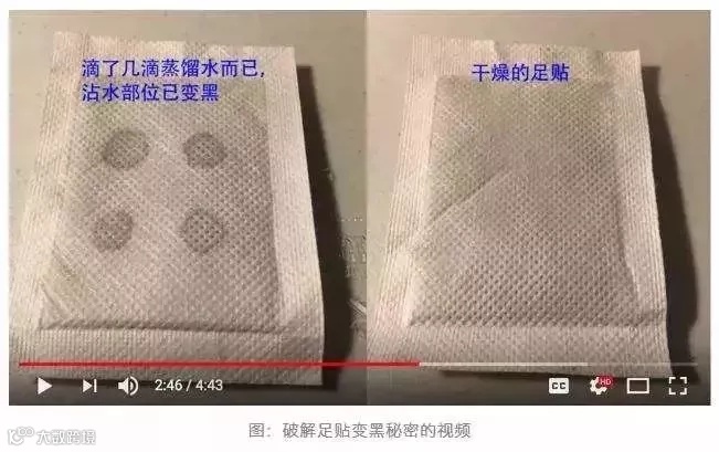 在足贴上滴几滴水,足贴也会变黑,倒的水越多,变黑的速度加快,变黑的面积也会变大。这说明足贴变黑与祛湿排毒没有关系,压根不是一回事。