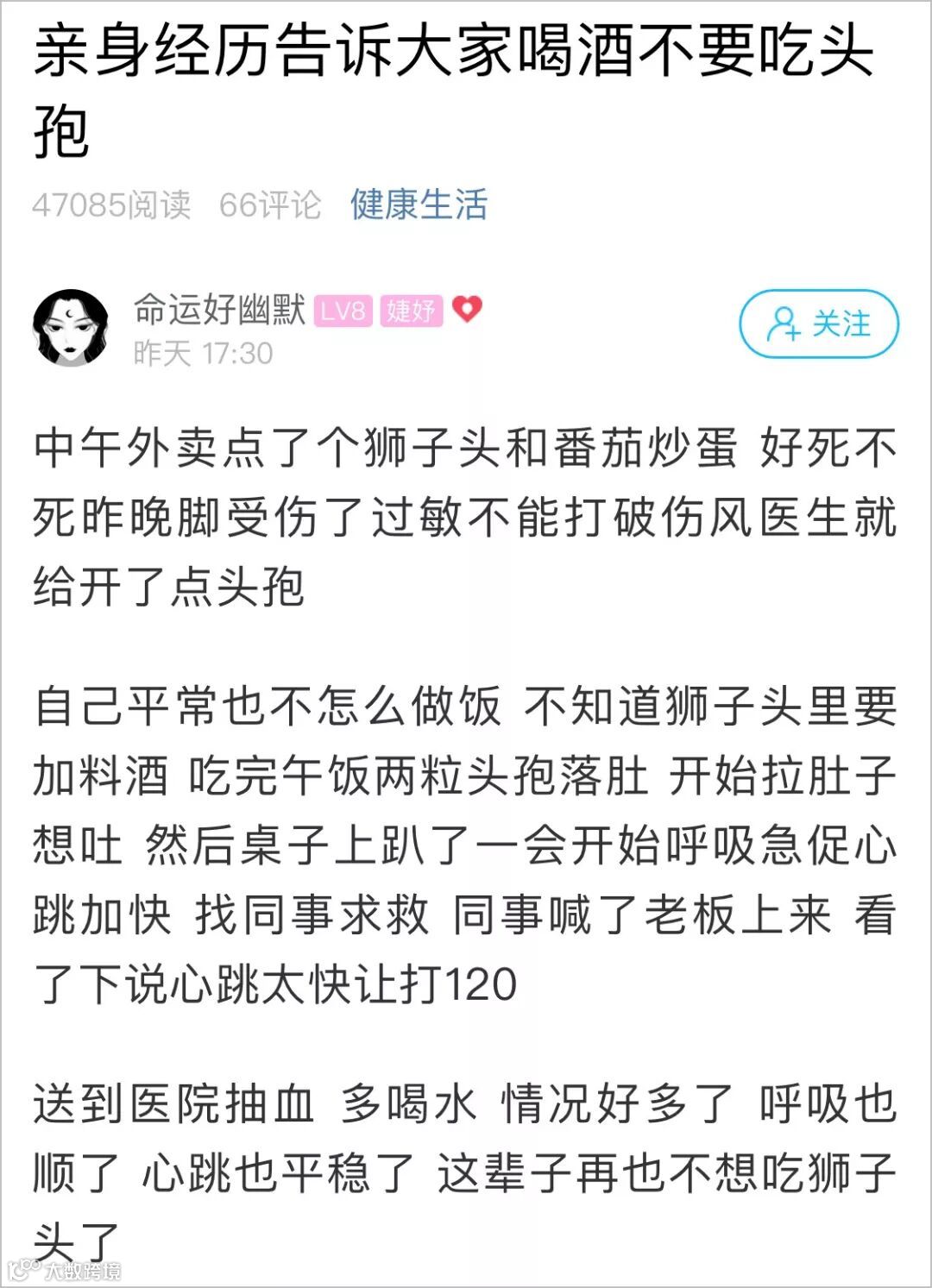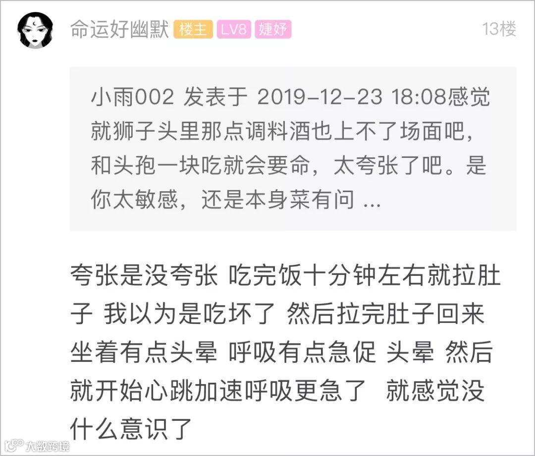 事后,姑娘得知狮子头里加了料酒,她觉得可能是料酒与头孢产生了「双硫仑样反应」,于是特地发帖提醒大家。