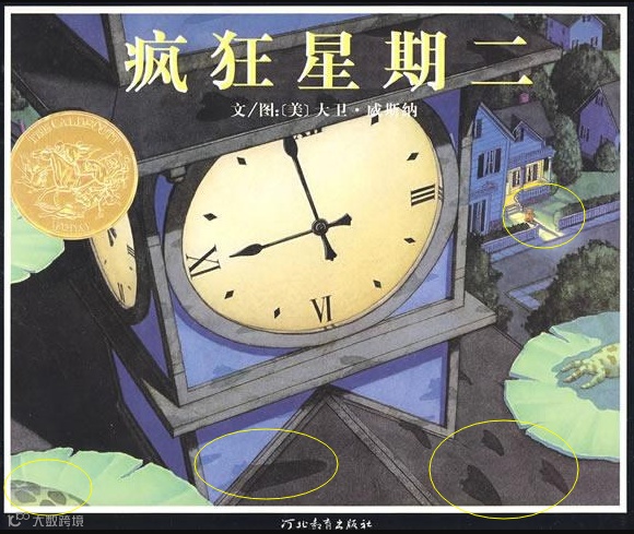 比如绘本《疯狂星期二》,封面上很多“诡异”的地方,给了我们好多悬念,让孩子好奇,这个故事到底有什么“疯狂”呢?