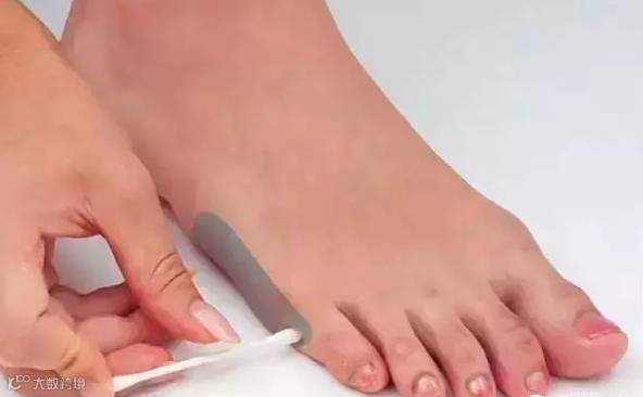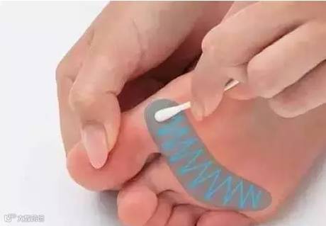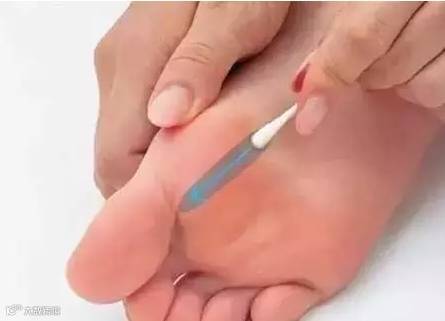 食指握靠棉花棒顶端,在食趾内侧以下到脚底中段长条区,朝脚尖方向“由下往上”推。