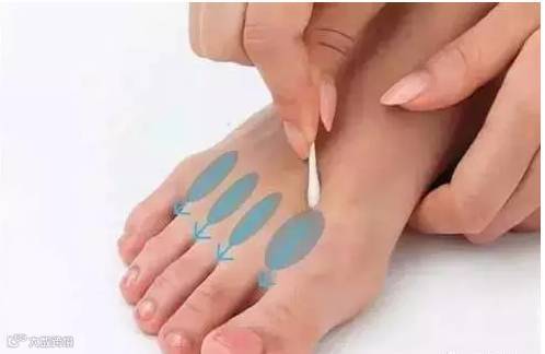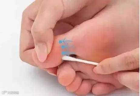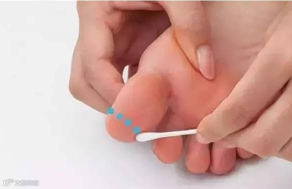 拇趾趾腹下方,棉花棒以斜45度角,用力往上按压第1、2关节。