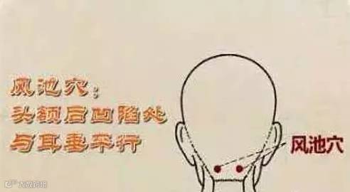 最常用的是后面这两个凹陷,一个是风池穴,在头额后凹陷处,与耳垂平行的位置。一个是风府穴,在颈后正中线上,后发际正中直上,与风池穴平行。