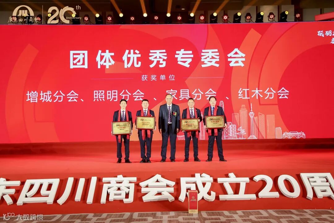 广东四川商会增城分会、照明电器分会、家具分会、红木分会获得团体优秀专委会称号,轮值会长、增城分会会长彭长春,执行会长、照明电器分会会长廖奎,执行会长、家具分会会长朱玉山,红木分会会长刘定杰分别代表获奖团体专委会上台领奖,由四川省政府驻外办事处王强巡视员颁奖。