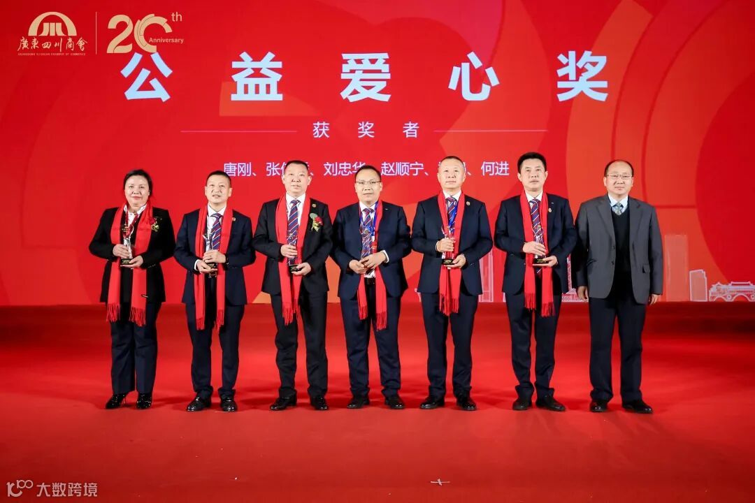广东四川商会轮值会长、执行会长唐刚,执行会长张信秀、刘忠华、赵顺宁、郑强,河源分会会长何进获得公益爱心奖,由广州市工商联余剑春副主席颁奖。