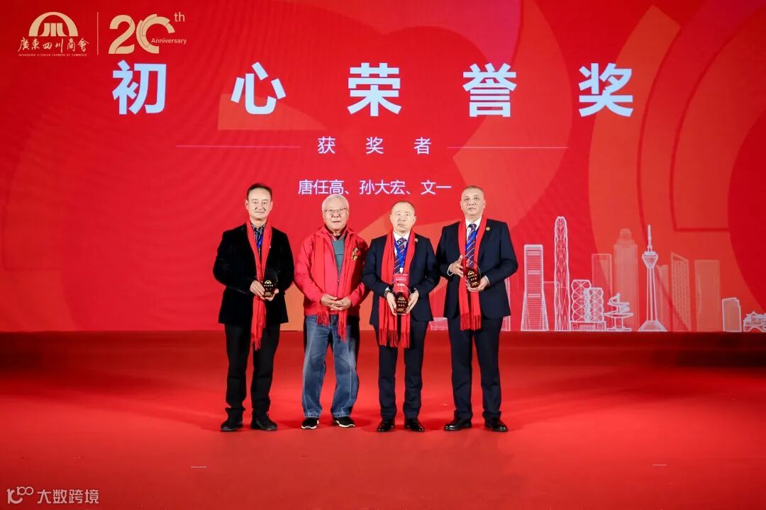 广东四川商会常务副会长唐任高、孙大宏、文一获得初心荣誉奖,由老领导石安海主席颁奖。