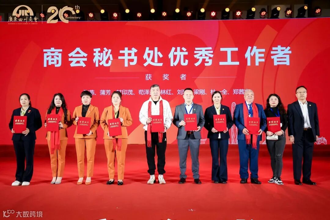 张燕、蒲芳、甘印茂、苟泽芳、林红、刘玲、梁刚、杜一全、郑茜文获得商会秘书处优秀工作者称号,由川商总会唐俊执行秘书长颁奖。