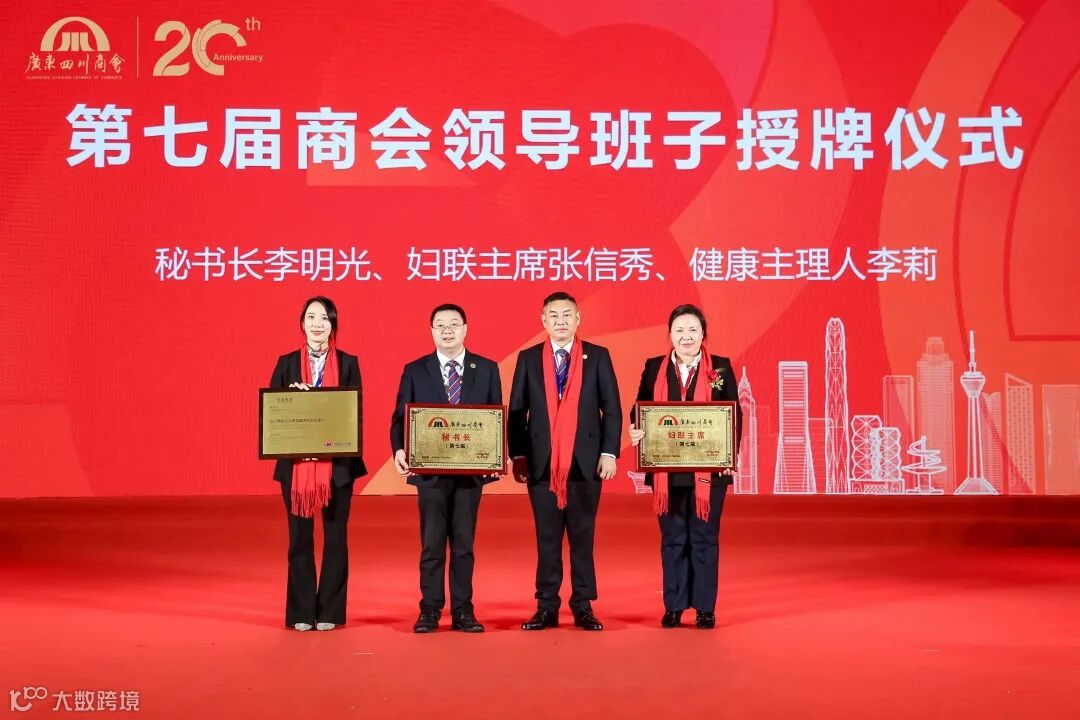 广东四川商会会长熊宗友为执行会长、妇联主席张信秀,秘书长李明光,常务副会长、健康主理人李莉授牌。