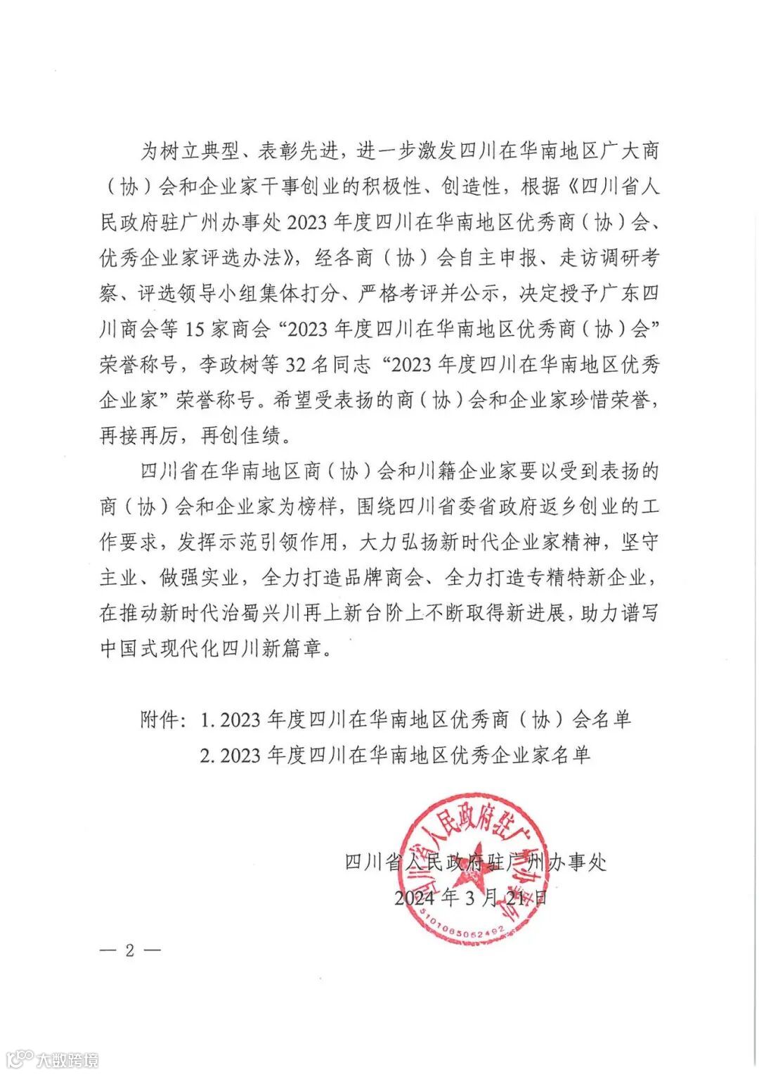 会议对2023年度表现突出的7家四川省驻华南地区机构先进单位、1家四川省驻华南地区机构信息宣传工作先进单位、15家四川在华南地区优秀商(协)会,10名四川省驻华南地区机构先进个人、32名四川在华南地区优秀企业家、18名第二届华南川籍农民工维权保障典型案例获奖案例代表进行了集中表扬。