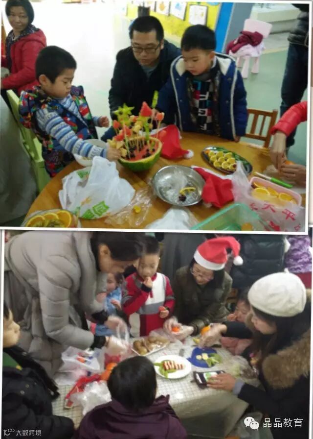 活动分为六个环节,分别是:幼儿歌舞新年快乐(Happy new year)、圣诞快乐(Merry Christmas)展示,家长才艺表演,亲子互动,感恩长辈送祝福,圣诞老人送礼物,亲子创意水果拼盘大比拼。
