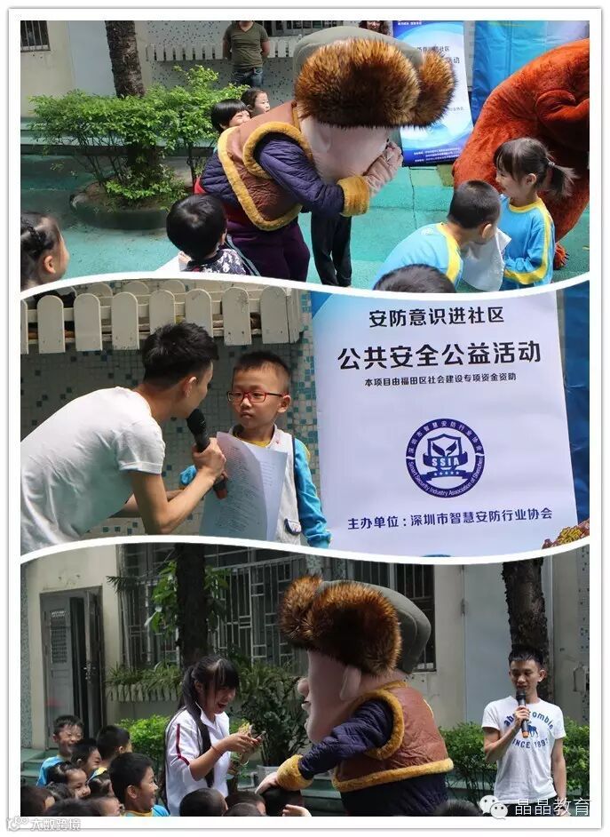 活动由深圳市智慧安防行业协会与幼儿园联合举办,主要通过讲解对全体师生进行安全意识的宣传,同时还利用孩子们喜欢的人偶现场互动,派发礼物。活动现场热闹非凡,本土动画人物“光头强”和“熊大”在主持人默契的配合下,将活动推向高潮,有奖问答如火如荼地进行着,孩子们踊跃地举手参加,欢声笑语交织一片。