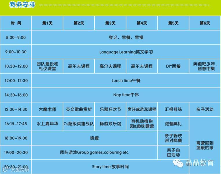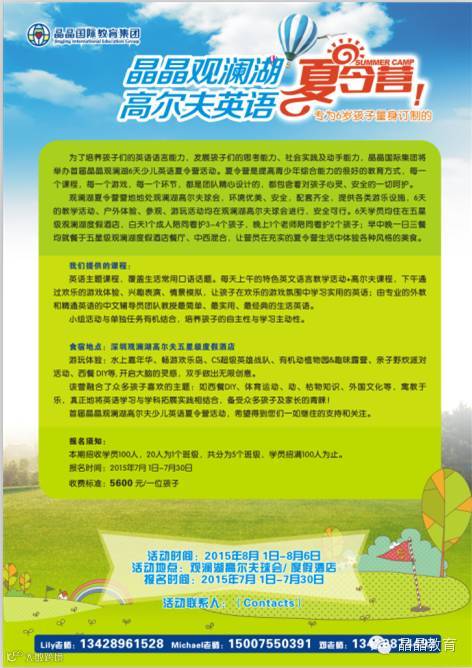 为了培养孩子们的英语语言能力,了解东西方文化精华;为了培养孩子们在优越的环境下,具有独立性,责任感,尊重及感恩;为了发展孩子们的思考能力、社会实践及动手能力,晶晶国际集团将举办首届晶晶观澜湖6天少儿英语夏令营活动。