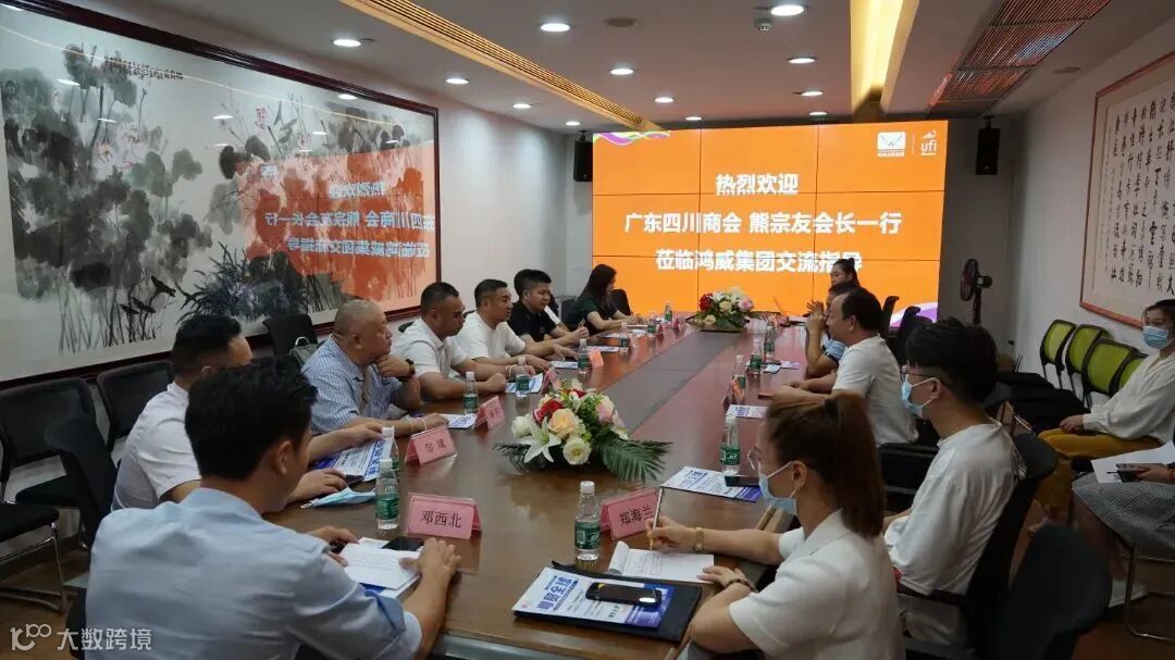 鸿威董事长王照云对熊宗友会长一行莅临指导鸿威集团表示热烈欢迎。他介绍了鸿威集团基本情况,鸿威集团是一家以会展多维视觉数字化互动营销解决方案的平台型科技集团。鸿威为帮助企业进行数字化转型升级采取了“三驾马车”--“2.33亿数据和数字孪生技术”+“粤贸全球”+“云展动力”,为企业搭建云展厅,打造沉浸式3D实景,720度全方位看产品、巡产线、展实力,全方位展示企业实力规模。王照云董事长希望鸿威能为广东四川商会会员企业服务。