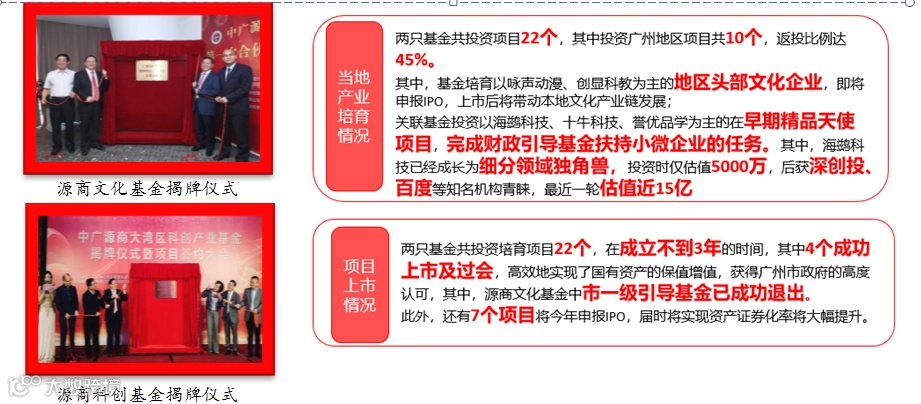 2018年,中广投资联合广州市及番禺财政资金引导设立了致力于重点培育广州及番禺地区文化科技领域总部经济和A股上市公司的源商文化基金,实收资本共1亿元,原河源市副市长曾培贤、源商投资董事长张国权、番禺产投董事长李一川等领导共同为源商基金揭牌。