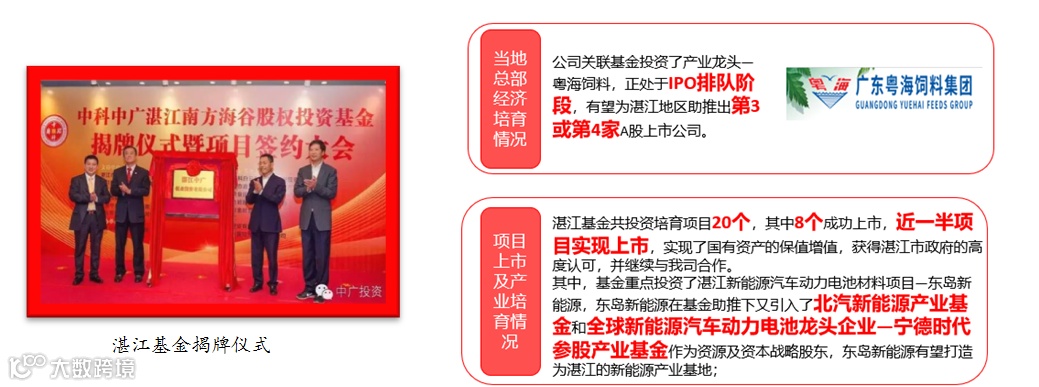 2016年,中广投资联合湛江市财政资金引导设立了致力于重点培育湛江地区总部经济和A股上市公司的湛江基金,是广东省粤西地区首支股权投资基金,实收资本共3.2亿元,由湛江市市长王中丙亲自为湛江基金揭牌。