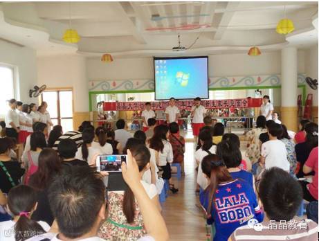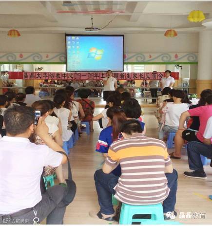 8月25日上午9:30晶晶大华幼教中心召开了2015年秋季新生家长见面会。业务园长郑园长主持了家长见面会,并对走进晶晶大华幼教中心的各位新朋友,表示了由衷的欢迎和诚挚的问候。本次会议首先由各岗位人员与家长们见面并送上深深地祝福;接着行政园长宋园长与大家分享了晶晶集团及幼儿园的办园理念、幼儿园的团队风采、课程设置以及各项工作开展的情况,同时,也详细的向家长朋友介绍了幼儿园一日生活作息时间、内容安排;特别详细说明需家长配合的工作及注意事项,例如:坚持送孩子来园、接送卡的正确使用、如何尽快让孩子适应幼儿园生活、家园教育活动的协助和配合、给予孩子正能量的引导教育、各项安全规定的履行与遵守等等。