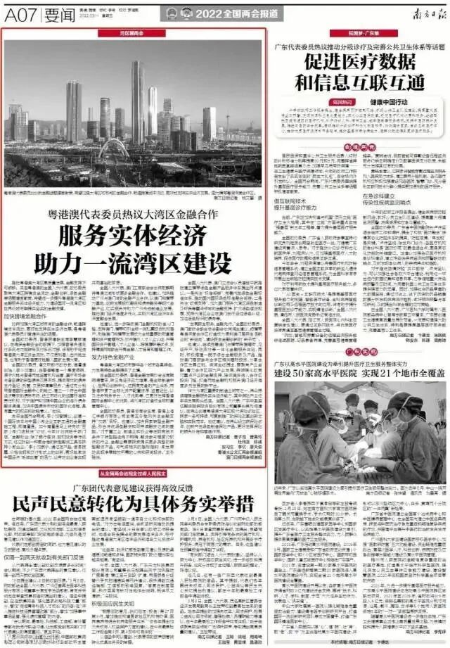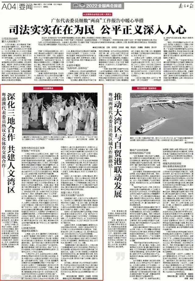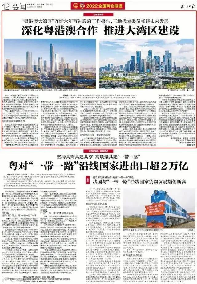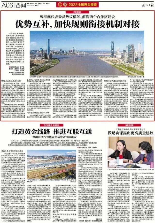 本文报纸稿《“粤港澳大湾区”连续六年写进政府工作报告,三地代表委员畅谈未来发展:深化粤港澳合作 推进大湾区建设》刊发于《南方日报》2022年3月6日A12版。