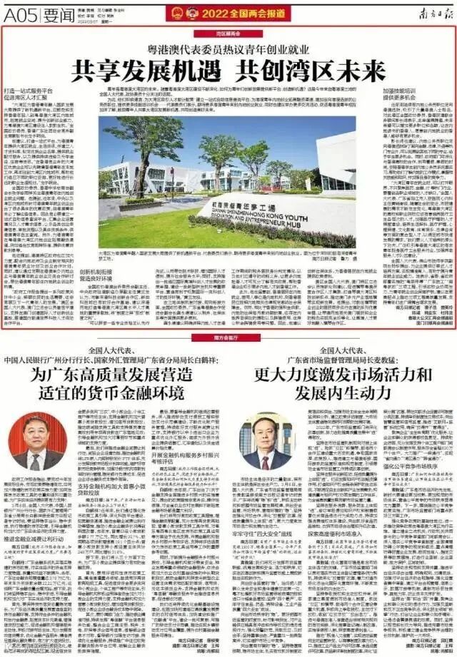 本文报纸稿《粤港澳代表委员热议青年创业就业:共享发展机遇 共创湾区未来》刊发于《南方日报》2022年3月7日A05版。