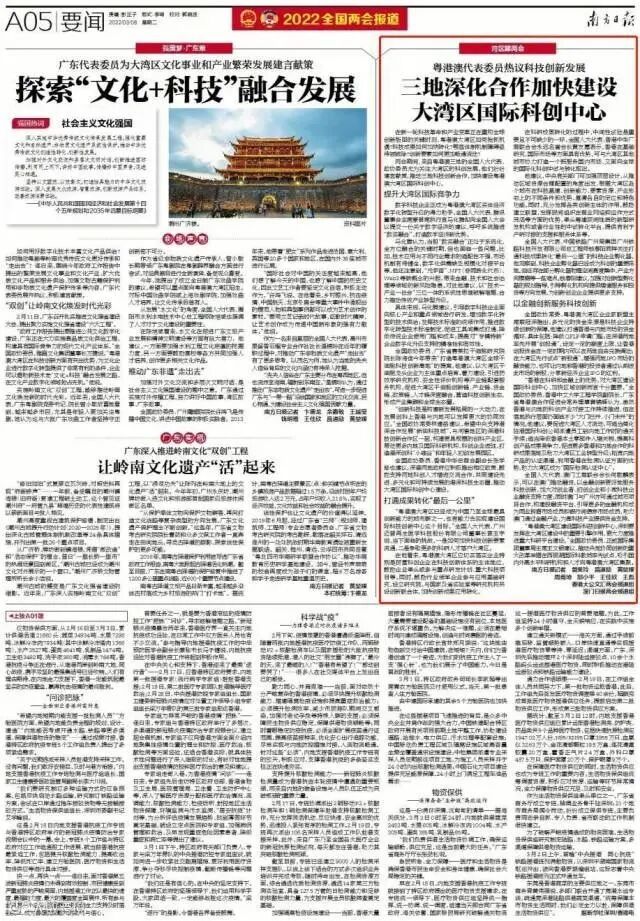 本文报纸稿《粤港澳代表委员热议科技创新发展:三地深化合作加快建设大湾区国际科创中心》刊发于《南方日报》2022年3月8日A05版。