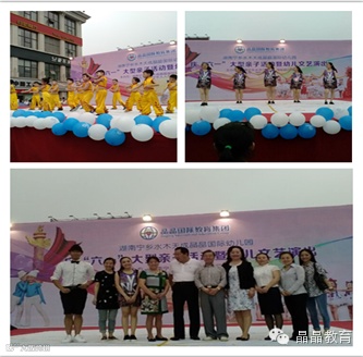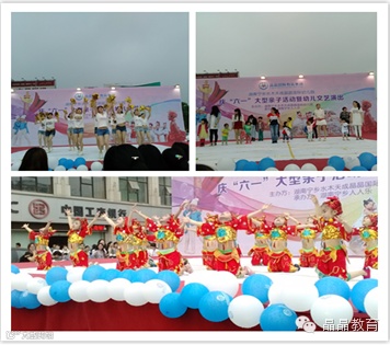 长沙市雨花区晶晶盛世华章幼儿园于2015年5月17日下午15:30点在通程奥特莱斯广场举行庆“六一”《亲亲祖国》儿童主题文艺汇演,邀请了全园家长和亲子班家长参与,本次活动有文艺表演、亲子同乐游戏、幼儿美术作品展,让孩子们真正成为节日的主人。整个活动在充满喜庆和活力的舞蹈《祖国,我心中的太阳》中拉开序幕。随后,小演员们还表演了舞蹈《嗨!我的梦》、《宝宝会走了》、《快乐儿歌》、《茉莉花》、《你是太阳我是星星》等多个舞蹈节目。