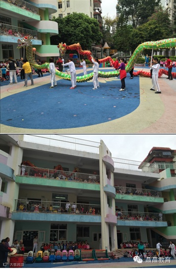 在一片欢天喜地的锣鼓声中天健幼儿园的老师和孩子们迎来了两条中国龙,原来是社区的人员和我们的保育老师为幼儿园舞龙来了,两条龙从大门到幼儿园三楼巡回一圈,给我们的开学典礼增光添彩,真可谓“开学喜羊羊,舞龙贺新年,敲响开门红”!