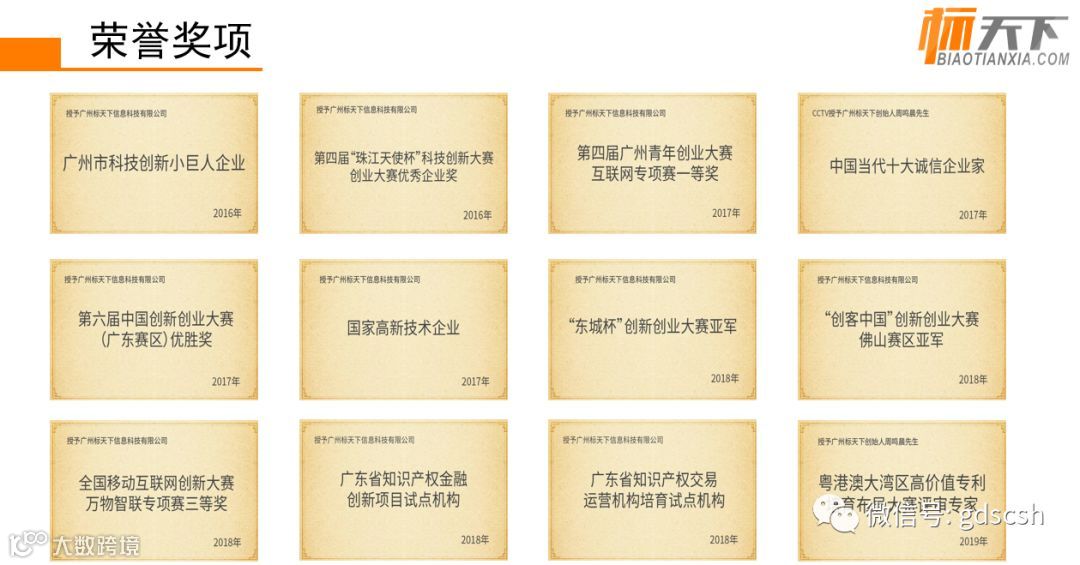 广州标天下信息科技有限公司,简称“标天下”,是一家融合线下线上优势的知识产权 + 互联网公司,目前已在广州,佛山设有分公司,平台致力于以互联网技术手段来改进传统的知识产权行业,先后通过大数据云计算、人工智能技术、区块链技术研发了多款行业先进的在线知产工具,为企业与用户提升75%以上的服务与使用效率,目前工具使用量超千万次,知产SKU过50万件,服务客户过万客户 ,2018年已获数百万天使融资!曾获中国创新创业大赛优胜奖,海青杯创业大赛一等奖!