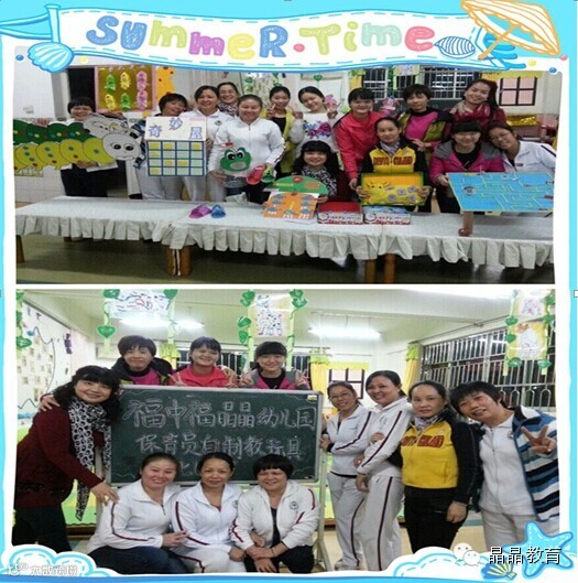 保教结合是幼儿园工作的特点。所以保育员不仅要做好班级保育保健工作,还要具有正确教育理念和技能,在日常工作中能自如地协助教师开展教育教学工作。为了提升保育员参与班级主题教育活动意识,提高保育员动手制作能力,福中福晶晶幼儿园于2014年12月16日举行保育员自制教玩具比赛活动。
