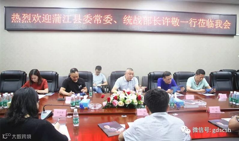 8月28日, 蒲江县委常委、统战部长、工业园区管委会主任许敬、蒲江县投资促进局副局长廖蓓蕾、蒲江县投资促进局项目管理科科长刘伟一行来访广东四川商会,双方就未来资源对接、互动合作做交流与展望,广东四川商会理事长朱曲波,党支部书记陈建斌,特邀顾问刘福和,副会长徐刚,新悦家居科技有限公司董事总经理朱玉阳等热情接待。