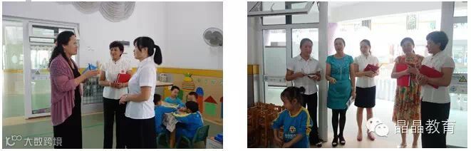 紧接着,对全园大环境、班级环境、新课程实施情况等做了详细了解,并有针对性地给出了宝贵建议,并提出了下次检查的内容和要求。如:建议我们还需投放更丰富的材料,让孩子能有更多种的材料进行操作,定时、定班级开展进区活动,并做好详细记录,将多种形式的幼儿作品进行展示,为“千百工程”打基础;在一楼书吧里可以搭建一个小舞台,让孩子可以讲故事,有一个展示自我的平台;二楼走廊的表演区,可以做一些服装道具,让孩子穿上拍成照片展示出来,让孩子们进到这个区域,不用老师讲也知道怎么玩……