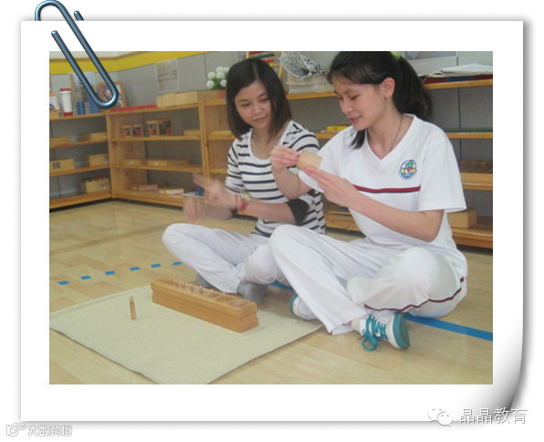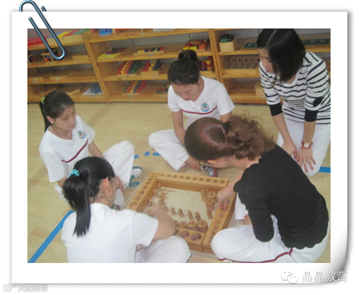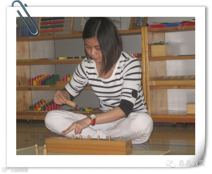 培训中,蒙氏教研组长刘老师通过让老师们角色扮演、互问互答、亲身体验三种方式进行。参与的老师们认真倾听、积极配合、参与性强。在参与工作——带插座圆柱体组时,4位老师感到意犹未尽;当讲到三项式时,大家都积极、踊跃尝试,当看到老师们在刘老师的指导下成功完成这项工作时,大家都非常有成就感。